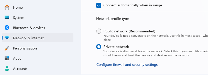 Note: If you run into access issues, check your Wi-Fi profile settings and ensure the network is set to Private: